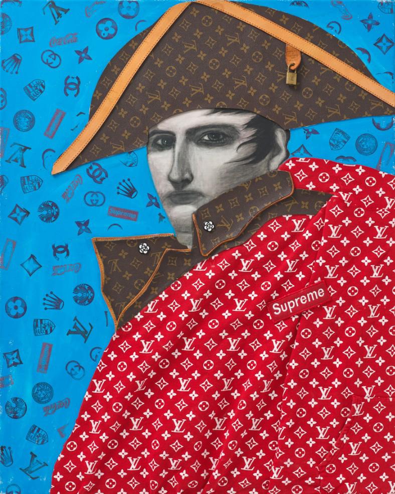 Description: Napoleon Bonaparte, draped in Louis Vuitton and Supreme, stands boldly against a digital brandscape. Merging imperial authority with consumerist absurdity, the piece interogates legacy, power and self-image
